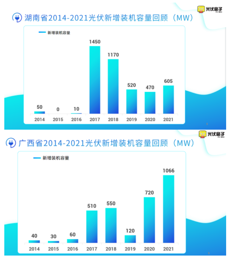 从去年两地的新增情况来看,2021年湖南光伏新增装机总量达到605MW,广西新增1066MW。近三年,两地装机量总体持续上涨,尤其广西及周边地区,迎来了空前广阔的市场空间。